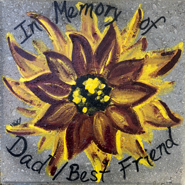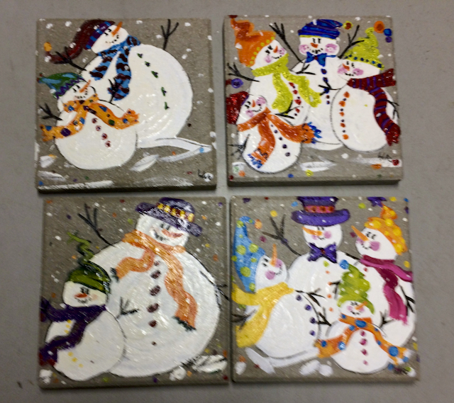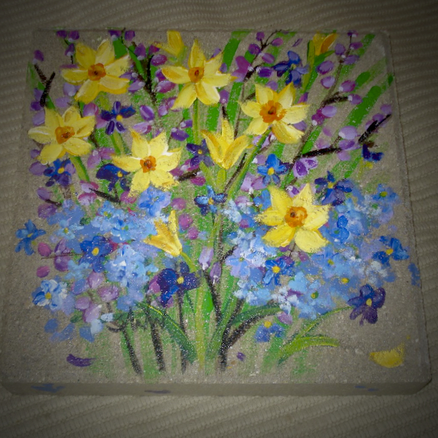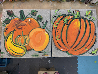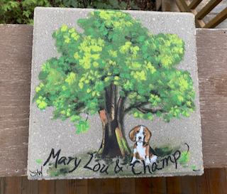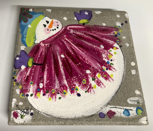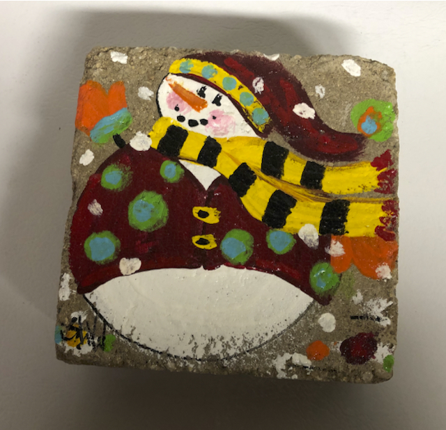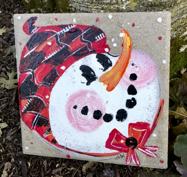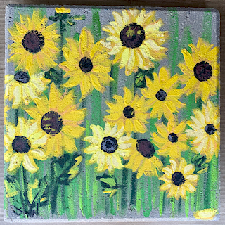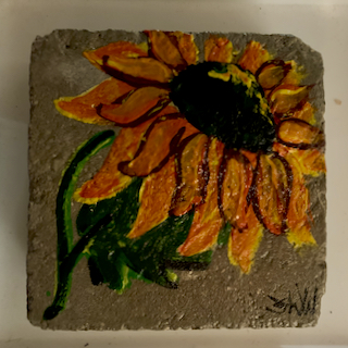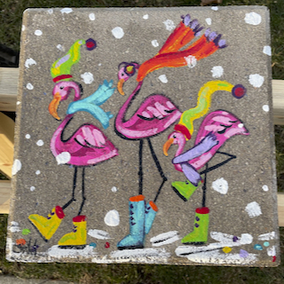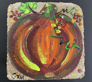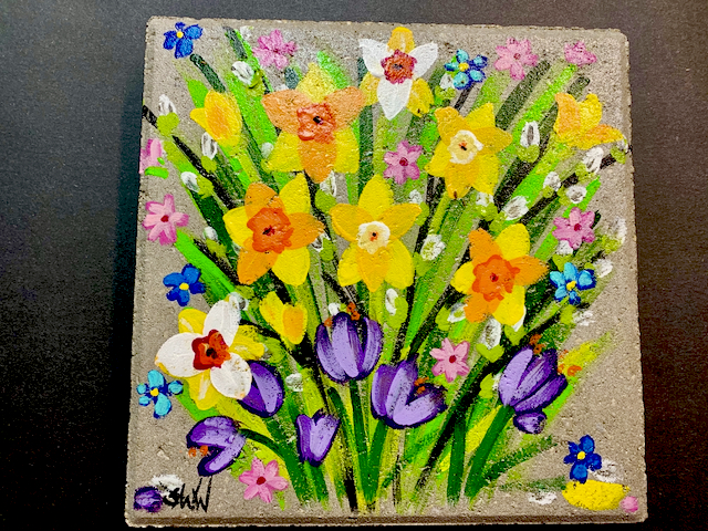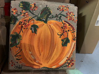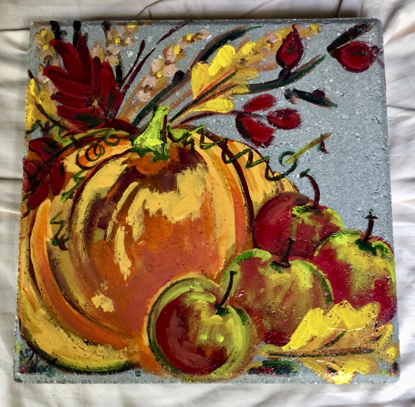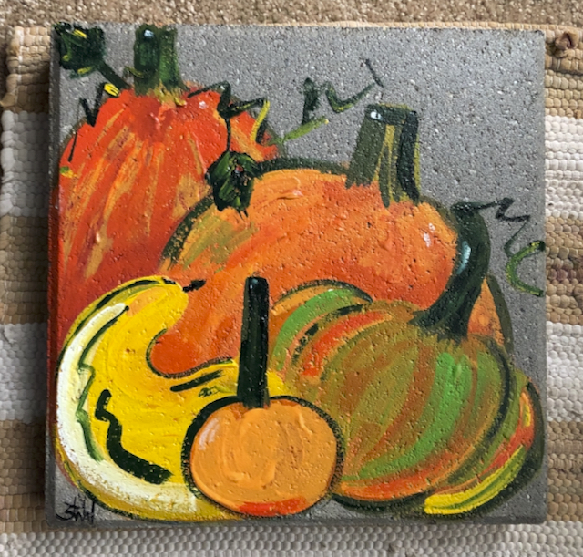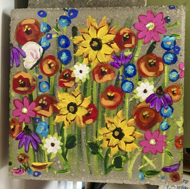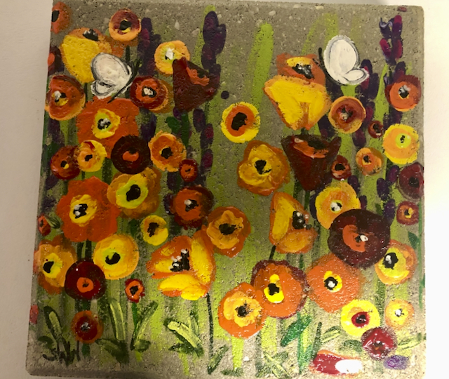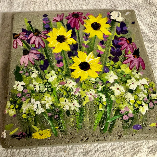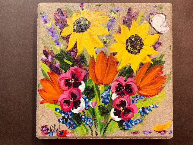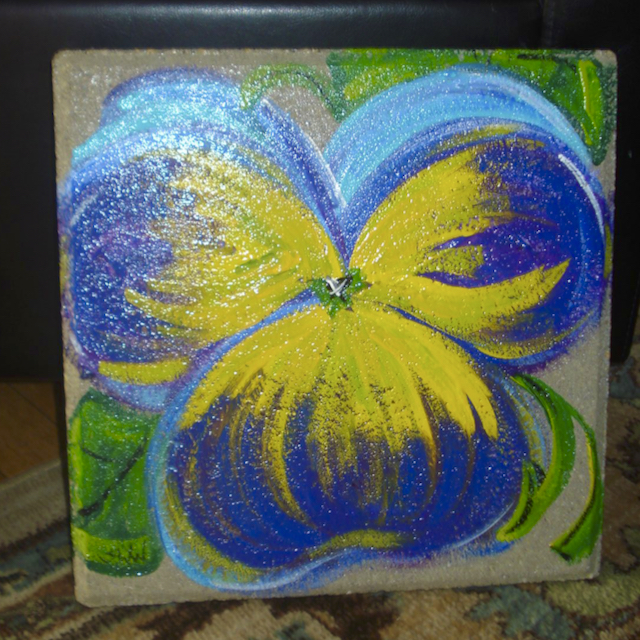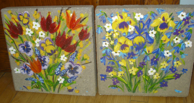 Here are examples of my original hand-painted stepping stones for indoor/outdoor use. They come sealed for all weather with UV protectant. Base prices: Large (12″x12″) – $25/ea. Small (6″x6″) – $15/ea.